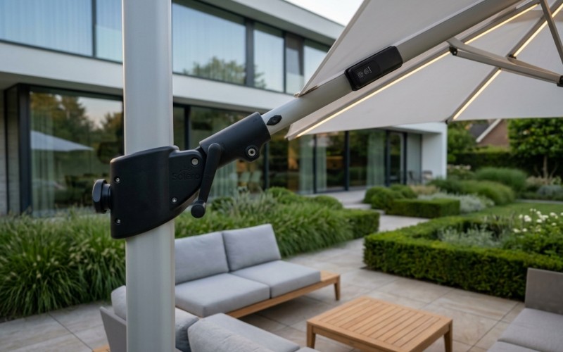Der Fratello LED verbindet stabile Bauweise mit einer modernen, reduzierten Formgebung. Durch den seitlich positionierten Mast bleibt die Fläche unter dem Schirm frei nutzbar und wirkt offen und großzügig. Die Bedienung erfolgt bequem über eine abnehmbare Kurbel, wodurch sich der Schirm leicht öffnen und schließen lässt. Die integrierte Beleuchtung ergänzt das Gesamtbild auf elegante Weise und sorgt für eine angenehme Atmosphäre – ideal für entspannte Stunden im Freien.