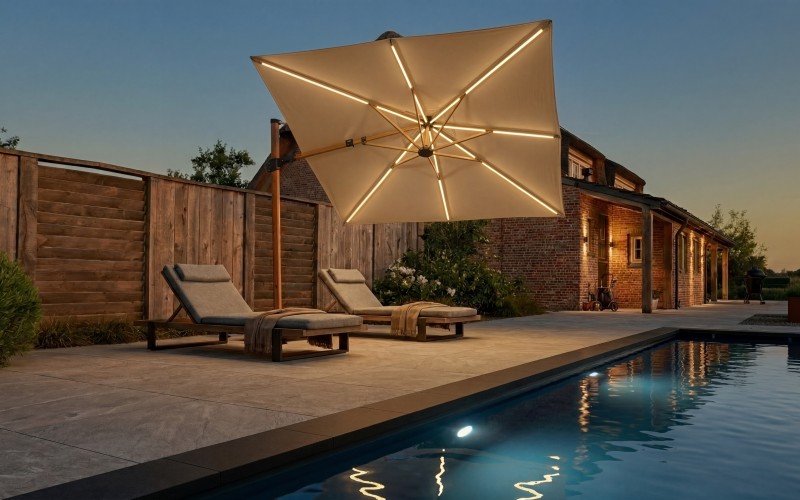 Der Fratello LED richtet sich an alle, die tagsüber angenehmen Schatten schätzen und abends eine stimmige Lichtatmosphäre genießen möchten. Die unauffällig in die Streben integrierte LED-Beleuchtung erzeugt ein gleichmäßiges, warmes Licht und setzt Ihre Terrasse dezent in Szene. Dank der 360°-Drehfunktion sowie einer Neigung von bis zu 45° lässt sich der Schirm flexibel an den Sonnenstand anpassen – für entspannten Komfort vom Vormittag bis in die Abendstunden.